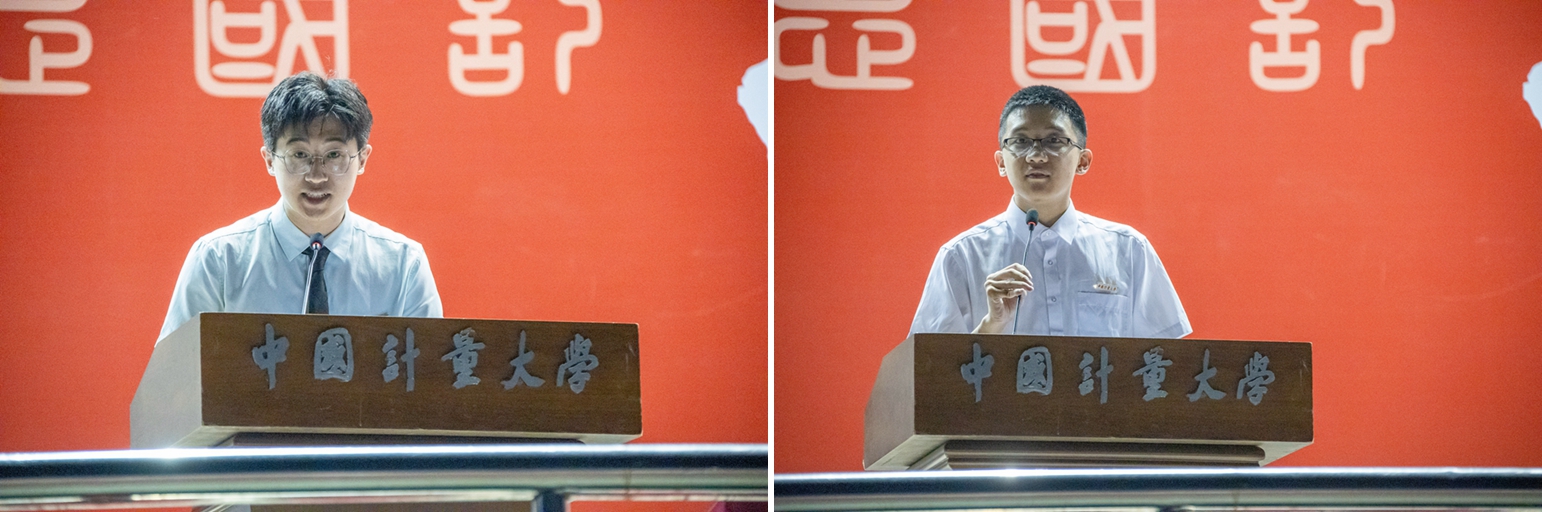 2021級研究生新生代表、機電工程學院苗鑫雨同學,2021級本科生新生代表、量新學院工試4班何濟遠同學以高昂的斗志與激情表達了自己對未來大學生活的憧憬與期待。