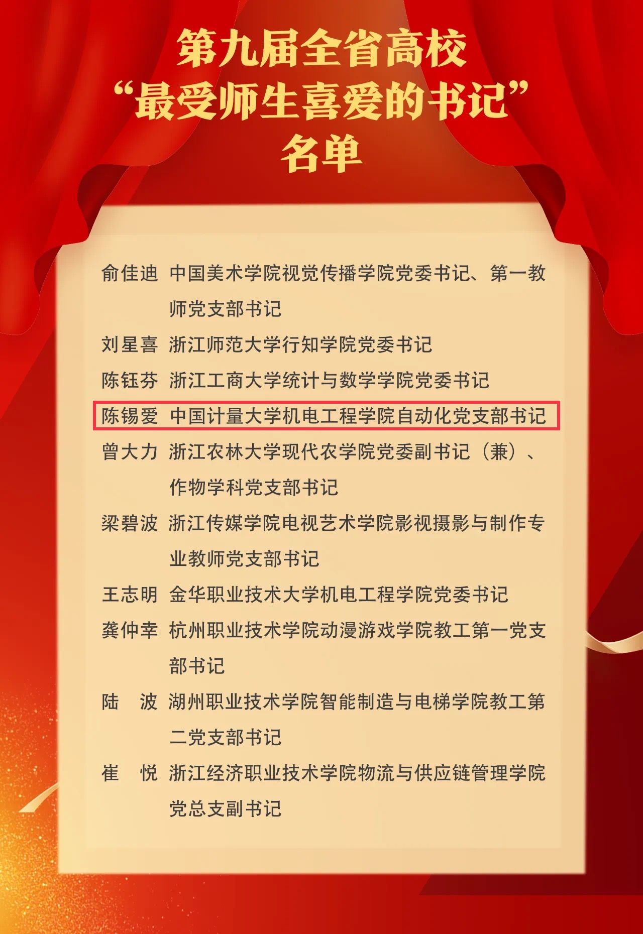 陳錫愛是我校優秀基層黨組織書記的一個縮影,在省高校黨建特色品牌“磁鐵工程”的賦能下,他抓實黨建強引領,帶領支部入選全國黨建工作樣板支部、省高校黨建工作樣板支部和省“雙帶頭人”教師黨支部書記工作室。他實踐賦能育新人,近3年指導學生獲全國大學生智能汽車競賽國家一等獎12項、二等獎9項,其中全國總冠軍3項,帶動600余名優秀學生創新創業。他匠心堅守當先鋒,獲浙江省高等教育教學成果一等獎和浙江省自動化學會高等教育教學成果一等獎。支部所在自動化專業入選國家一流本科專業,通過教育部工程教育認證。