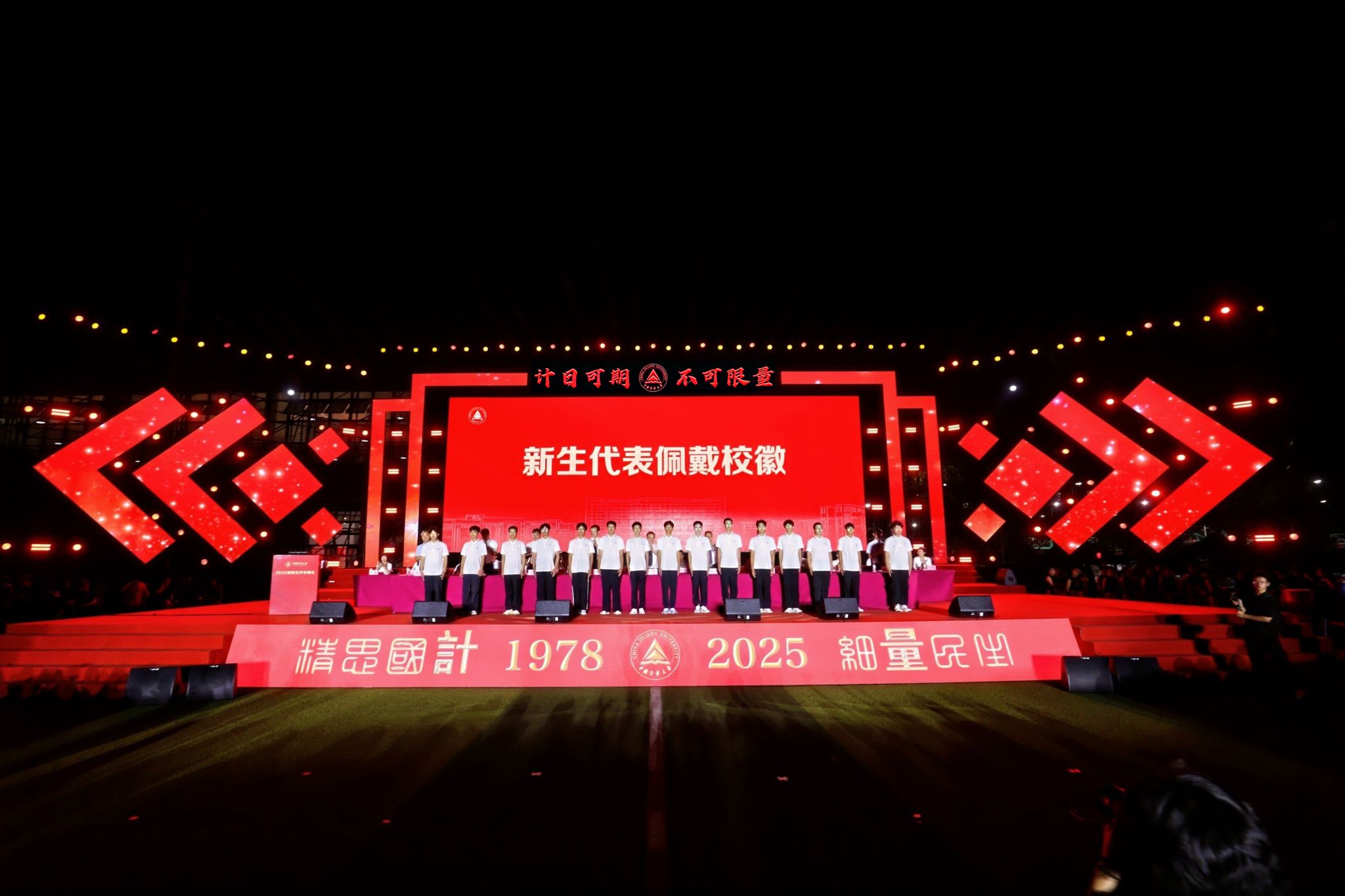 聚光燈下,校領導為2025級新生代表莊重地佩戴上校徽。一枚枚校徽在燈光下熠熠生輝,這不僅是身份的象征,更是使命的傳遞。從這一刻起,他們將以量大學子的全新身份開啟大學的新征程,將肩負起“精思國計、細量民生“的使命擔當,以十足的熱情和昂揚的斗志,奮發成長為一名奮勇向前、心系天下的新量大人。