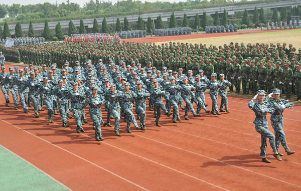 9月7日上午9:30,我校2012年學生軍訓匯報表演暨總結表彰大會在北田徑場隆重舉行。校長林建忠,校黨委副書記徐涌金、陶偉華,副校長馮時林、俞曉平、宋明順,校紀委書記王小華,黨委委員、學生處處長范慶瑜,空軍28師首長范俊華、嘉興場站副站長唐軍、秘書科科長唐新亮,及各二級學院領導、全體軍訓工作領導小組成員出席大會。大會由黨校辦主任楊政主持。