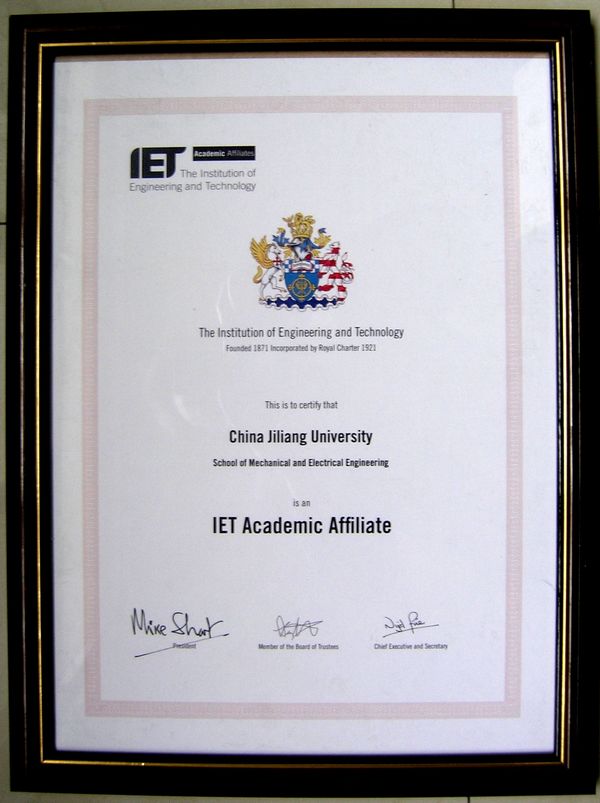 2012年1月5日在北京香格里拉酒店,擁有140年歷史的歐洲最大、全球第二大專業學術學會和全球最大的國際注冊工程師資質認證機構IET(英國工程技術學會),向中國計量學院(機電工程學院)頒發了IET“教育合作伙伴”的資質認證證書。同時接受IET“教育合作伙伴”的資質認證證書的還有華北電力大學(控制與計算機工程學院)、寧夏大學(物理電氣信息學院)。這是繼清華大學、北京郵電大學和寧波諾丁漢大學之后,又一批成為IET教育合作伙伴的院校。這樣目前在中國共有六所院校成為IET的教育合作伙伴。
