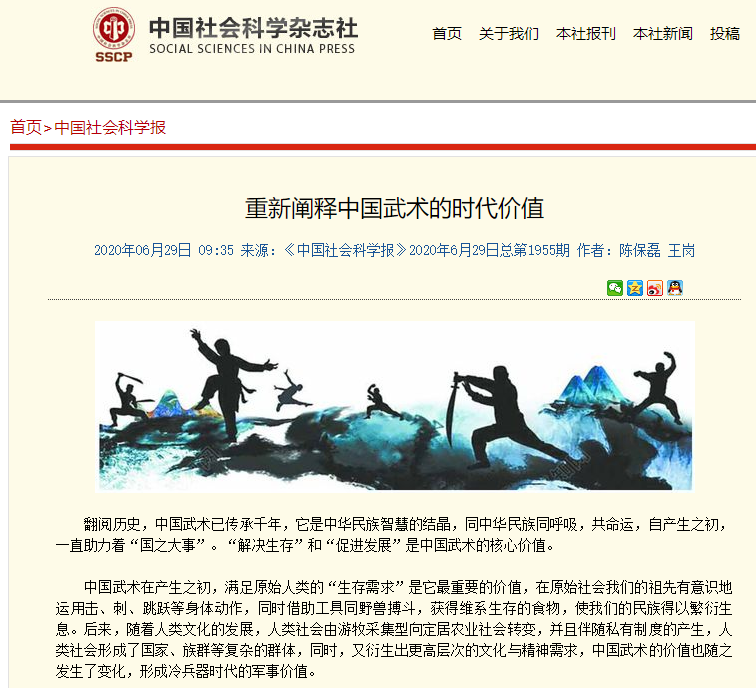 6月29日,《中國社會科學報》第8版總第1955期理論專題,整版刊發了我校體軍部陳保磊老師題為《重新闡釋中國武術的時代價值》的文章。