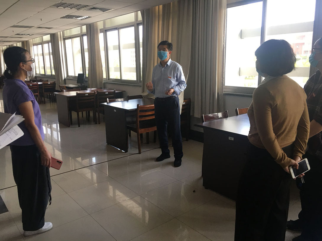 4月30日下午,宋明順校長帶隊到圖書館,檢查指導疫情防控和迎接師生返校的各項準備工作。他走訪了圖書館服務大廳、藏書庫、閱覽室等場所,聽取了圖書館關于開放安排、入館流程、座位布置、消殺保潔等方面的匯報。