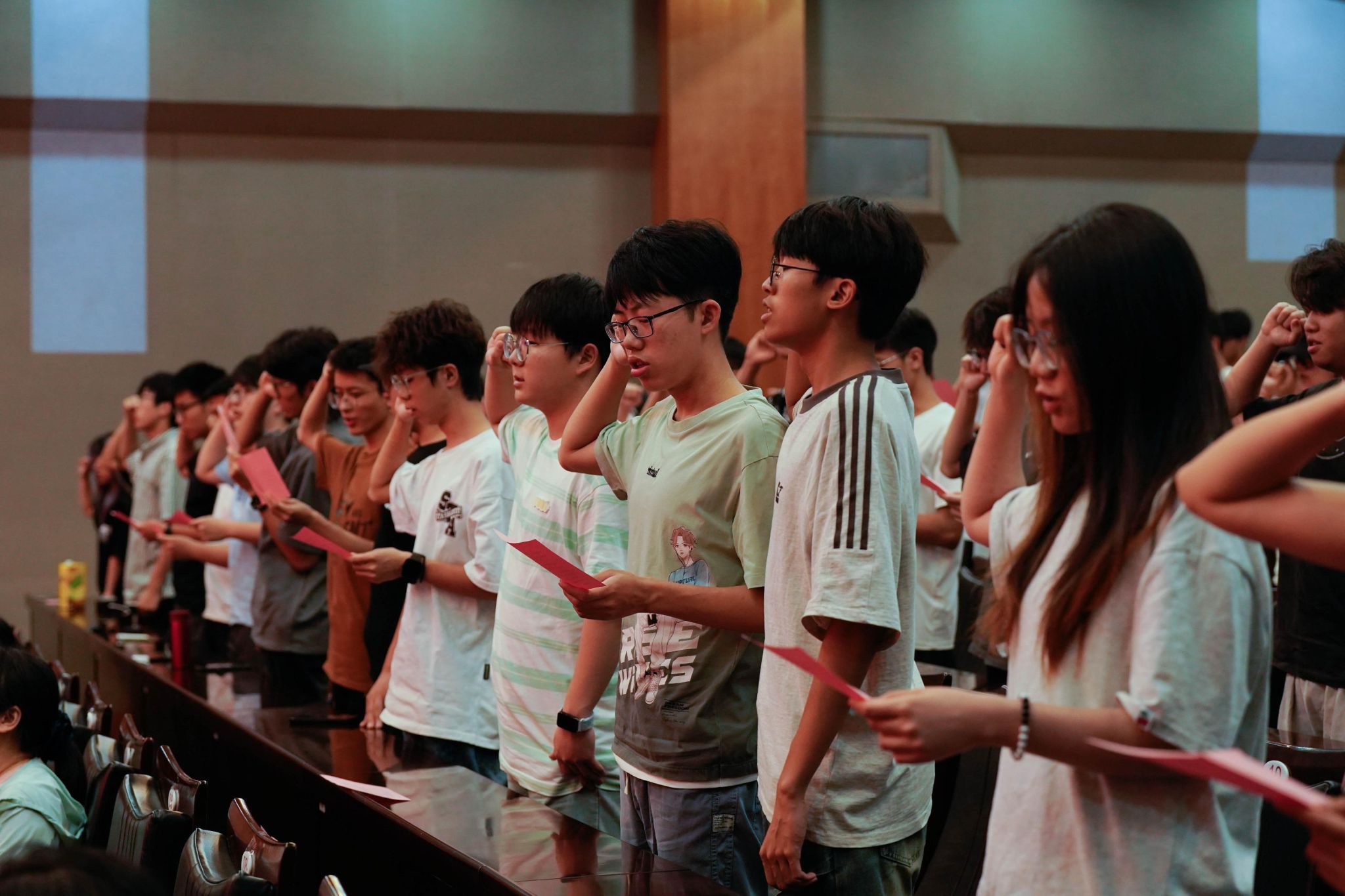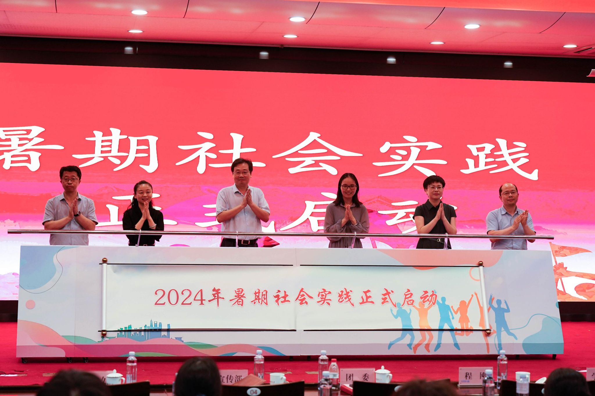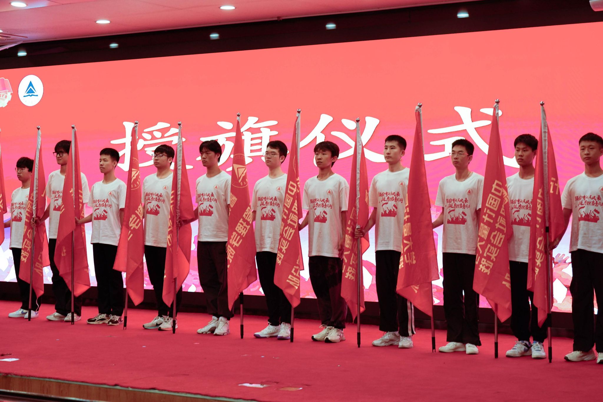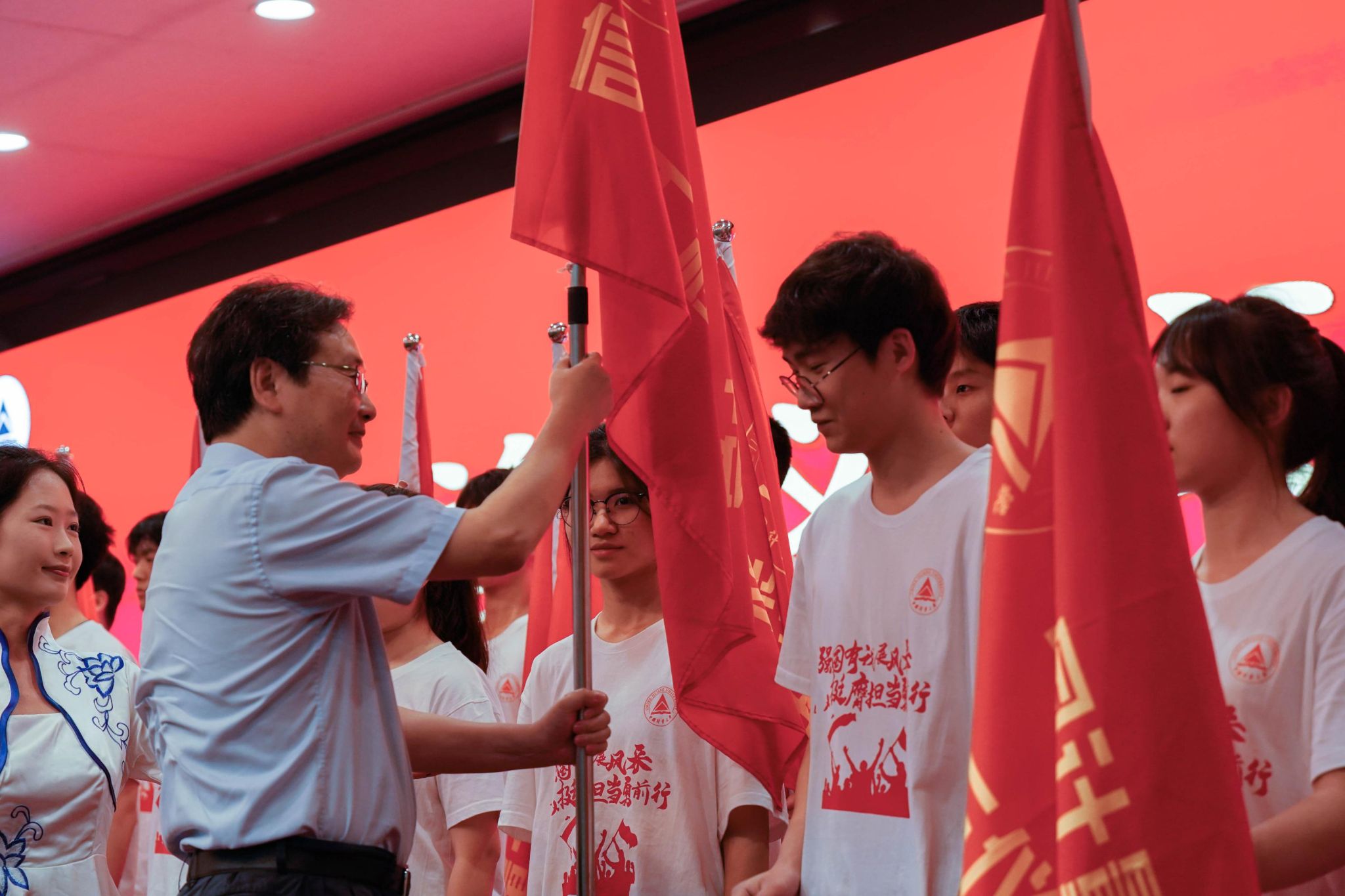啟動儀式上,實踐隊員現(xiàn)場集體宣誓,表達投身暑期實踐的熱情和決心,來自校國旗護衛(wèi)隊以及退役軍人之家的舉旗手高揚各學院實踐旗幟,程剛為各學院實踐團隊代表授旗,并與相關職能部門負責人一起推動啟動臺橫桿,共同宣布2024年校暑期社會實踐活動正式啟動。