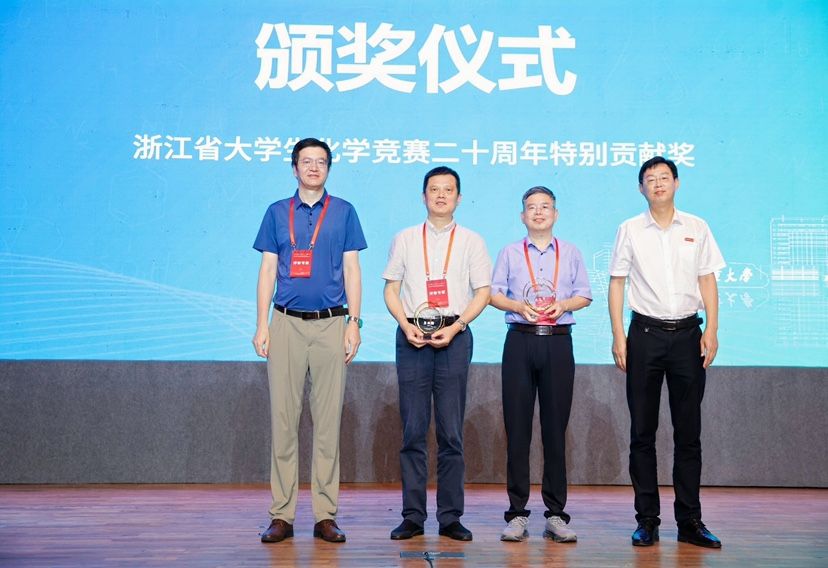 會上,答辯組組長浙江大學林旭鋒教授、實踐能力考核組組長浙江工業大學強根榮教授還就本屆競賽創新課題研究和答辯情況以及實驗環節考察情況分別作總結發言,衛國英院長對賽事承辦工作進行總結。會議對獲得第十五屆浙江省大學生化學競賽擬獲獎隊伍進行隆重表彰,并就明年浙江省大學生化學競賽承辦進行了會旗交接。組委會還專門為方文軍、強根榮、倪哲明3位教授頒發浙江省大學生化學競賽二十周年特別貢獻獎。