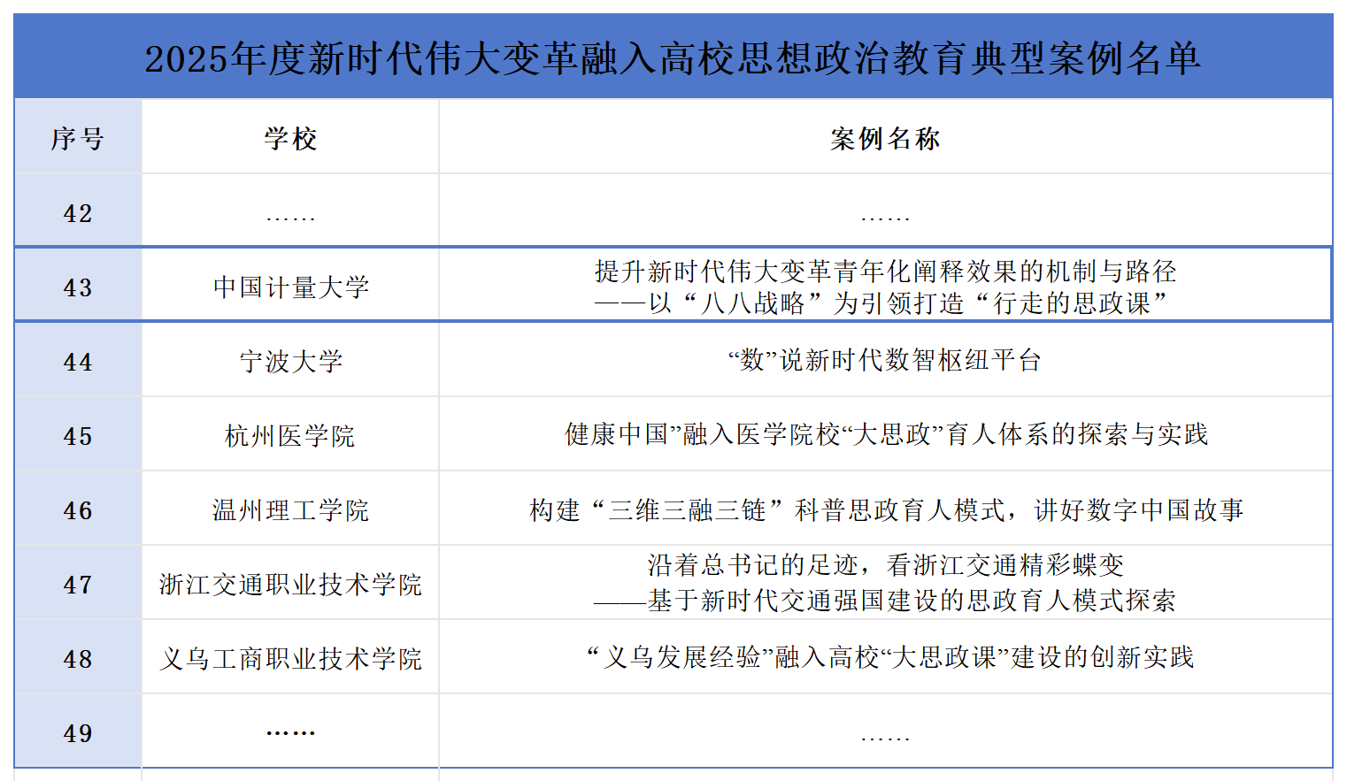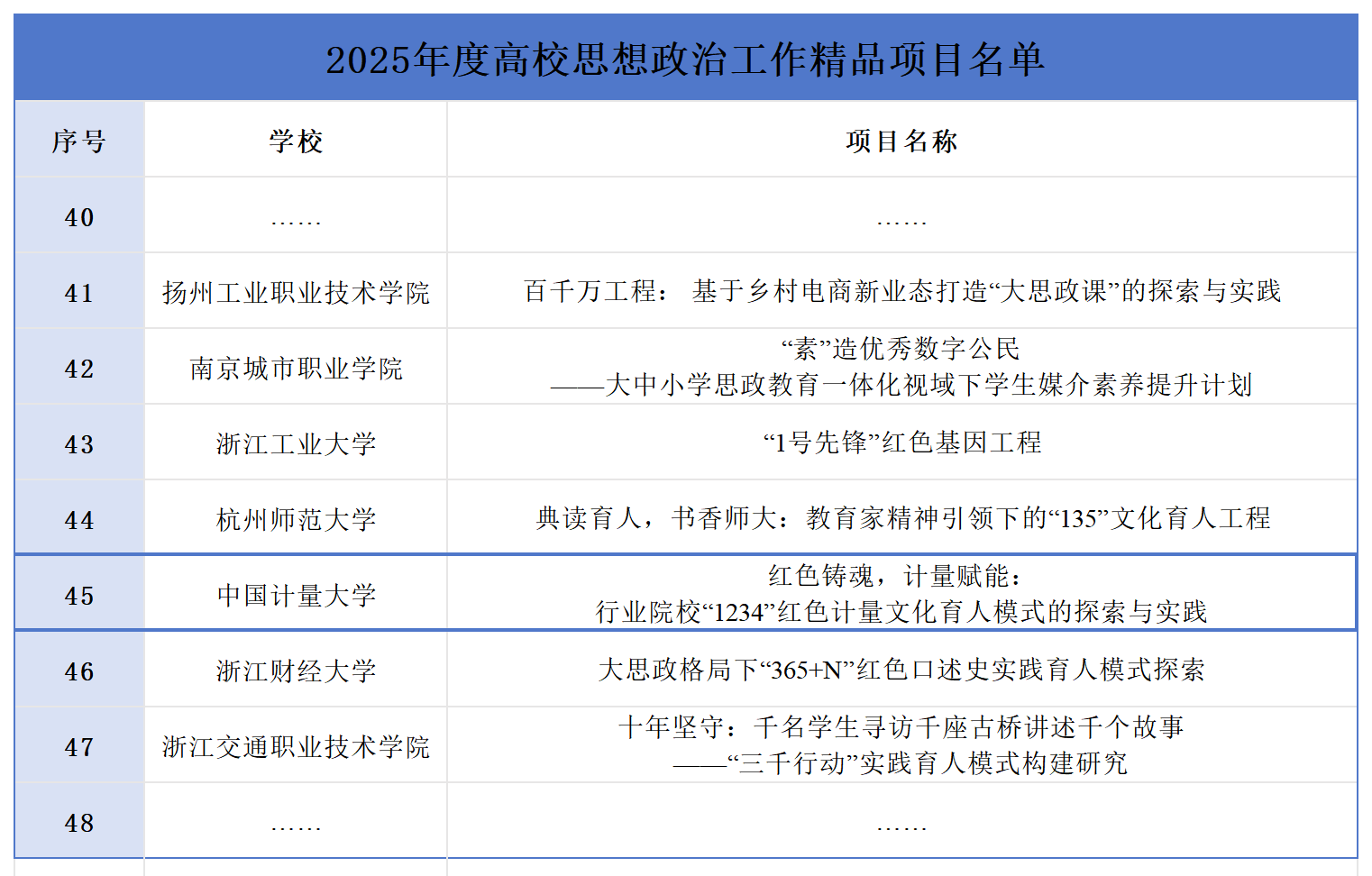 近日,教育部辦公廳公布了2025年度高校思想政治工作質量提升綜合改革與精品建設項目入選名單,我校共有2個項目入選,其中《紅色鑄魂,計量賦能:行業院?!?234”紅色計量文化育人模式的探索與實踐》入選2025年度高校思想政治工作精品項目,《提升新時代偉大變革青年化闡釋效果的機制與路徑——以“八八戰略”為引領打造“行走的思政課”》入選2025年度新時代偉大變革融入高校思想政治教育典型案例。